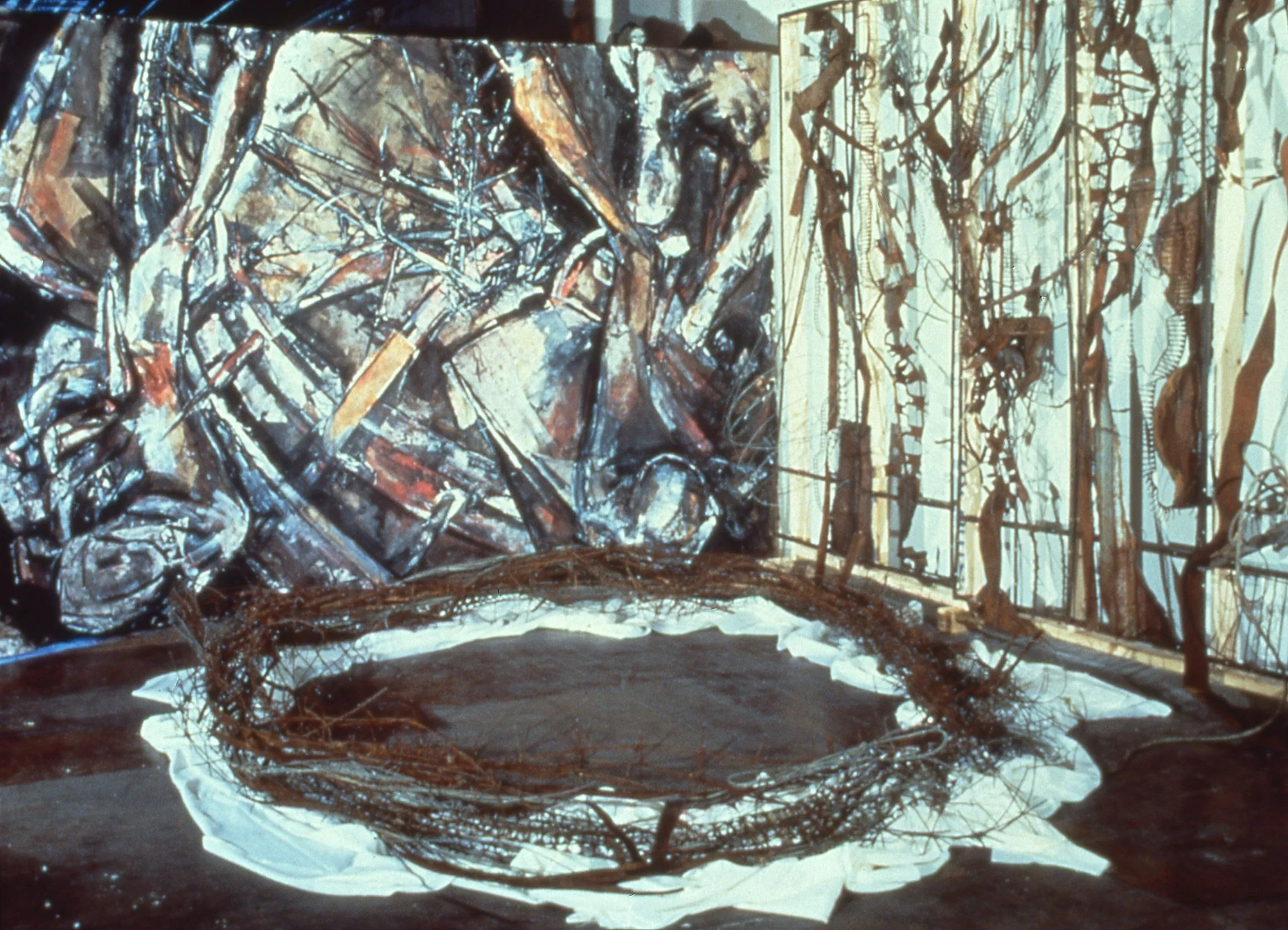 Mixed media on paper, dirt, fabric, wood, candles, rocks; 96” x 144“