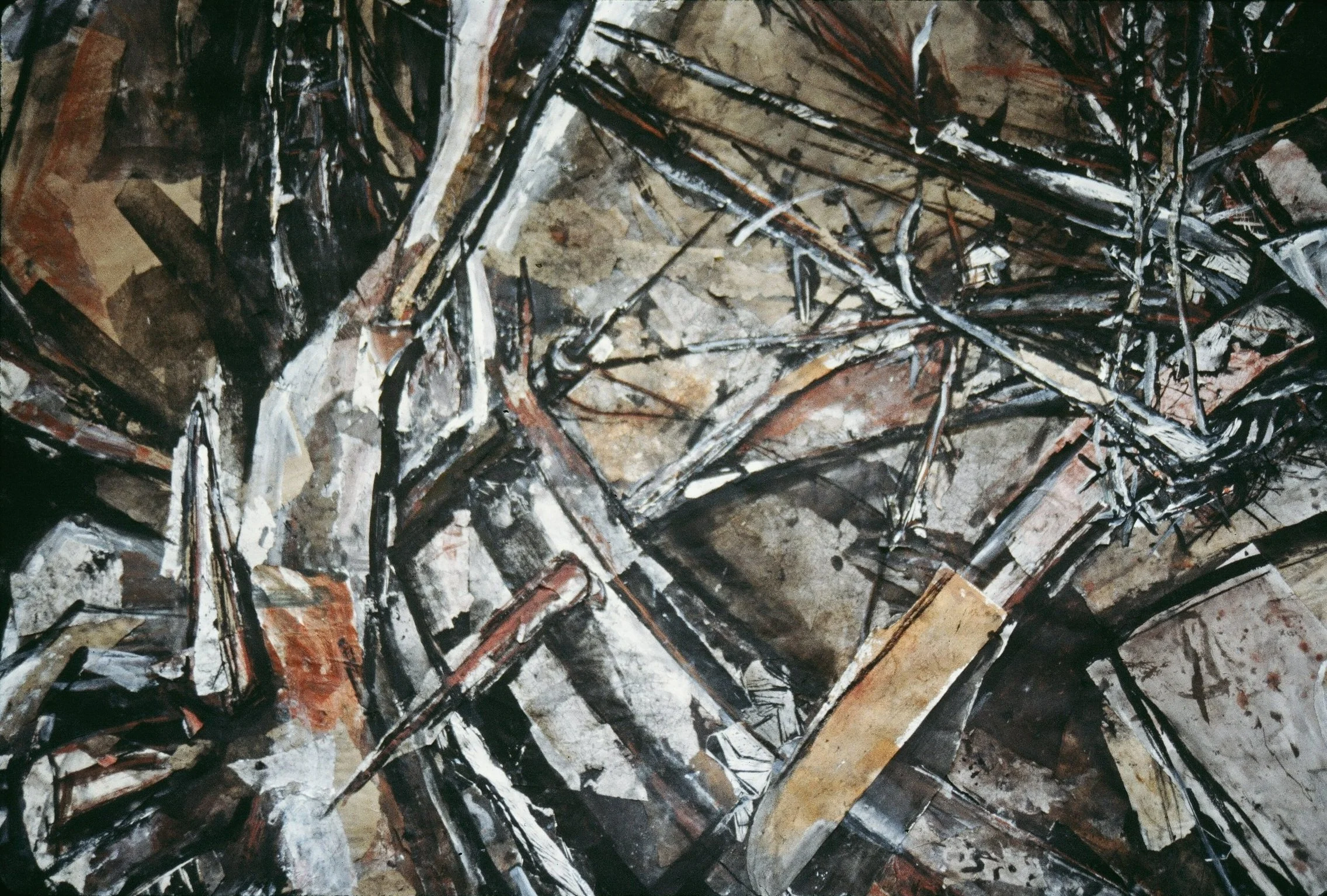 (Detail): Mixed media on paper, dirt, fabric, wood, candles, rocks; 96” x 144“