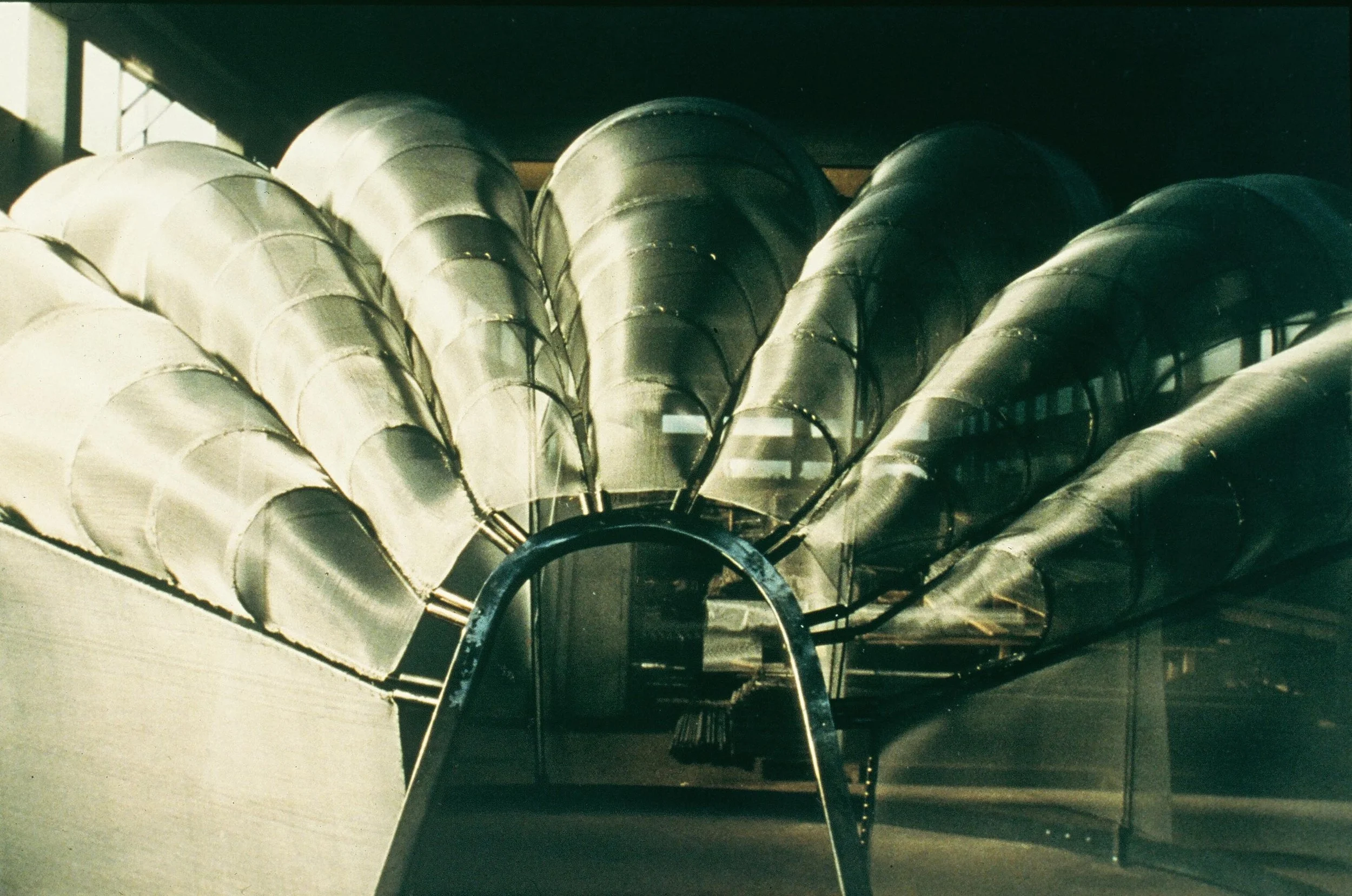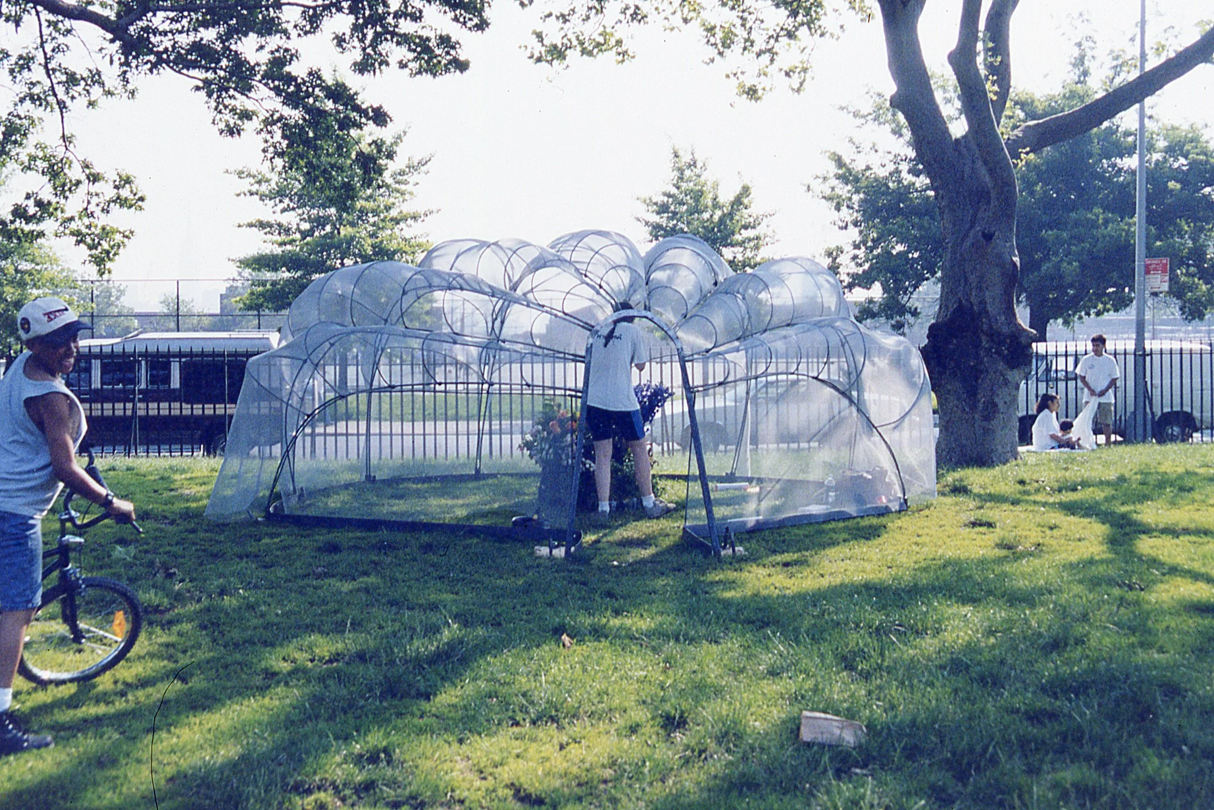 Sanctuary: Environmental Festival at McCarren Park, Brooklyn, NY; Aluminum fabric, steel; 96” x 180” x 180”; 1998. "Shell Sanctuary" in its first presentation as part of the 1998 Environmental Festival in McCarren Park. The Sanctuary serves as a community hub for various activities, including brainstorming issues and reforms for the North Brooklyn community. These included the 97A Waterfront Plan; Greenpoint oil spill; Street ends and piers; the sewage treatment plant; open space and parks (all waterfront land was fenced off); boating and canoeing on the water; Newtown Creek cleanup; transportation and storage of radioactive material in the neighborhood; and much more. Since that time all of these areas have either been dealt with or they are in the process of remediation.