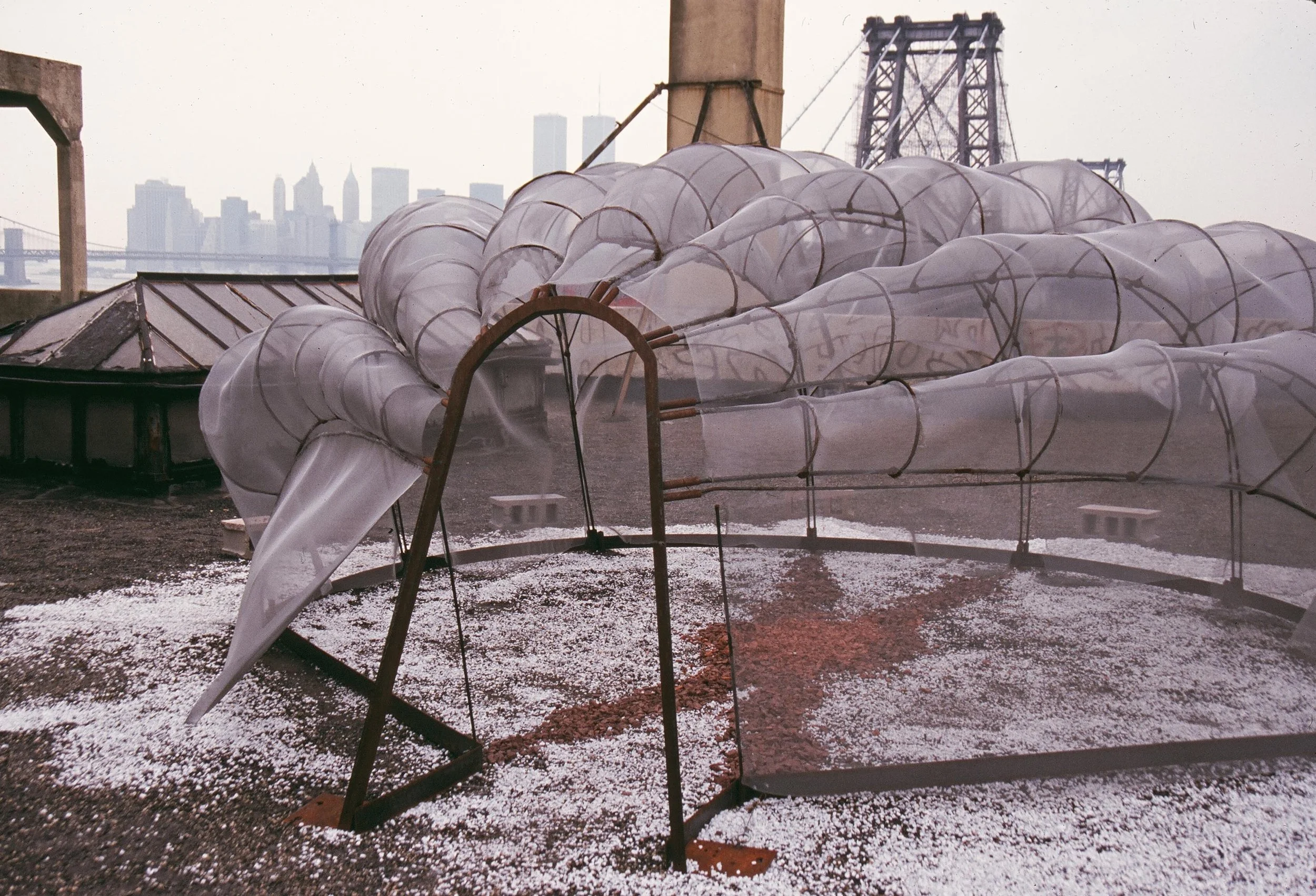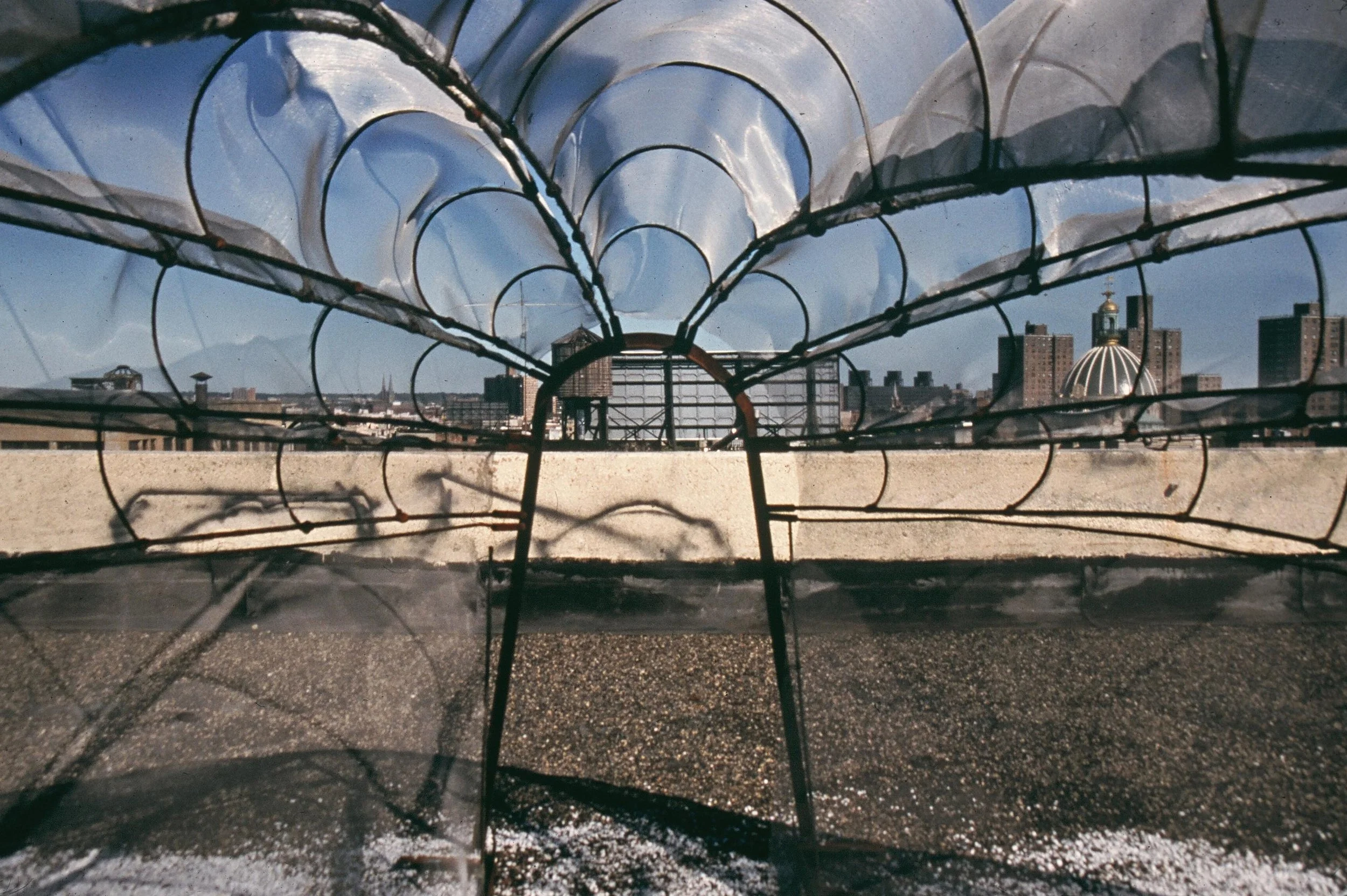 Rooftop Dialogues, Brooklyn (Berry Street); Aluminum fabric, steel; 96” x 180” x 180”; 1998