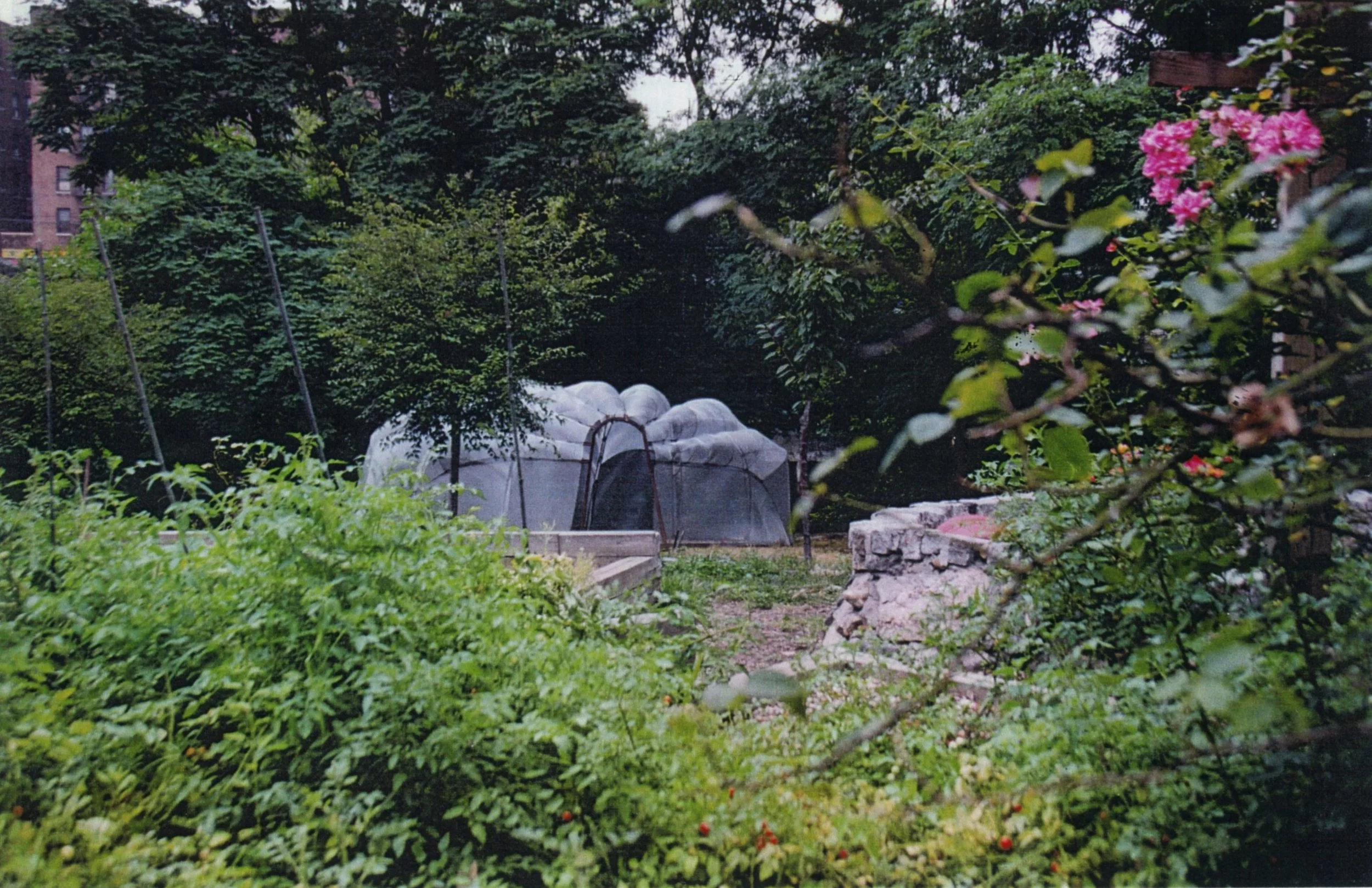 Sanctuary by the Bronx River, Phipps Houses; Aluminum fabric, steel; 96” x 180” x 180”; 1999 - 2001; A collaboration with Phipps Houses and the Bronx River Environmental Center, Sanctuary was located exactly at the edge of the Bronx River serving as a platform for on-going workshops and discussions with school children regarding environmental cleanup and remediation.